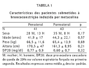 RESULTADOSNão houve diferenças estatisticamente significativas em relação à idade, sexo, peso, altura e dose provocadora causadora de queda de 20% no VEF1 entre o grupo 1 (fenoterol) e o grupo 2 (formoterol) (Tabela 1).
