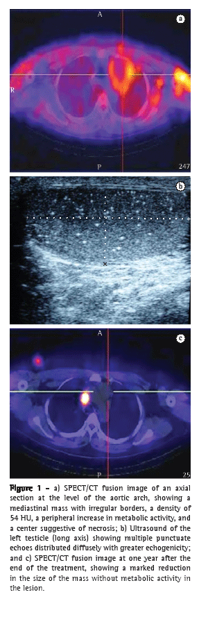 Bronchoscopy revealed hyperemic, edematous bronchial mucosa with hemorrhagic stippling and traces of blood in the bilateral basal segments, although there was no active bleeding. There was no invasion of the lumen or ulceration of the bronchial wall. A CT-guided biopsy of the mediastinal mass was performed. The histopathological study of the biopsy sample showed necrosis, cell detritus, and large pleomorphic cells, in which the cytoplasms were clear, the nuclei contained coarse chromatin, and the nucleoli were evident, with a neoplastic appearance. Immunohistochemical staining showed a positive response for cytokeratin AE1/AE3, chorionic gonadotropin hormone, and alpha fetoprotein, although the responses to synaptophysin and the leukocyte antigen, which are common in neoplastic cells, were negative. The anatomopathological diagnosis was of a seminomatous GCT, a diagnosis that was underscored by the findings of normal serum alpha fetoprotein and moderately elevated serum Beta-hCG. To evaluate the extent of the tumor, we carried out SPECT/CT scans of the abdominal cavity, pelvic cavity, brain, and liver but failed to identify any abnormalities. The TM was identified through ultrasound (Figure 1b). Vascularity was found to be adequate in both testicles. The patient received six cycles of chemotherapy with cisplatin, etoposide, and bleomycin. After the treatment, the hemoptysis resolved. In addition, post-treatment SPECT/CT fusion imaging showed a reduction in the size of the lesion and the absence of any metabolic activity within the lesion, a condition that persisted at one year after the end of the treatment (Figure 1c).