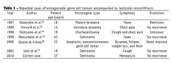 We recently treated a patient diagnosed with a primary seminomatous germ cell tumor (GCT) accompanied by testicular microlithiasis (TM). To our knowledge, there are only six published cases documenting an association between primary seminoma of the mediastinum and TM.(2-7)