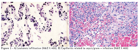 To exclude patients presenting the steady deterioration characteristic of a chronic process, ARF was defined as the onset of symptoms of respiratory distress less than ten days prior to the OLB. All OLBs were performed at the discretion of the attending physician, progressive hypoxemia being the most common indication. The details of the OLB procedure and specimen processing at our institution have been described elsewhere.(8) In brief, OLB was performed under general anesthesia. Through a limited thoracotomy, tissue samples were removed with a cutting stapler. We followed a specific protocol for specimen processing. A portion of the surgical specimen was sent to the Electron Microscopy and Surgical Pathology Department of our facility, where the frozen and paraffin sections were examined after appropriate staining. The remaining portion of the specimen was sent to the Microbiology Laboratory, where smears were prepared, and part of the tissue was homogenized. Sections were cultured for aerobic and anaerobic bacteria, as well as for fungi, mycobacteria, Legionella, Nocardia, Chlamydia and viruses. In addition, sections were stained with Gram stain for bacteria and with Grocott's stain for fungi and Pneumocystis carinii (P. Jiroveci), as well as with Ziehl-Neelsen stain for mycobacteria and Nocardia. The results of the stainings were usually available within 3 h after specimen arrival in the laboratory.
