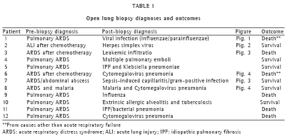 Objetivo: Verificar o impacto dos resultados da biópsia pulmonar a céu aberto nas decisões que determinem mudanças nas estratégias de tratamento de pacientes críticos, com infiltrados pulmonares difusos e insuficiência respiratória aguda refratária, bem como na melhora de seu quadro clínico. Métodos: Foram avaliados 12 pacientes com insuficiência respiratória aguda e sob ventilação mecânica, que foram submetidos à biópsia pulmonar a céu aberto (por toracotomia) após a ausência de resposta clínica ao tratamento padrão. Resultados: A maior causa isolada de insuficiência respiratória aguda foi a infecção viral, identificada em 5 pacientes (40%). A avaliação pré-operatória da causa da insuficiência respiratória foi modificada em 11 pacientes (91,6%), e um diagnóstico específico foi feito em 100% dos casos. A taxa de mortalidade foi de 50%, a despeito das mudanças no regime terapêutico. Seis pacientes (50%) sobreviveram e obtiveram alta hospitalar. Todos os pacientes que obtiveram alta sobreviveram por pelo menos um ano após a biópsia pulmonar a céu aberto, totalizando uma taxa de sobrevida em um ano de 50% dentre os 12 pacientes estudados. Quanto aos pacientes que faleceram no hospital, o tempo de sobrevida após a biópsia pulmonar a céu aberto foi de 14 + 10,8 dias. Conclusão: Concluímos que a biópsia pulmonar a céu aberto é uma ferramenta útil no controle da insuficiência respiratória aguda quando não se observa melhora clínica após o tratamento padrão, já que pode resultar em um diagnóstico específico que requeira tratamento distinto, provavelmente diminuindo a taxa de mortalidade desses pacientes.