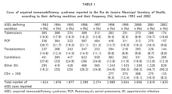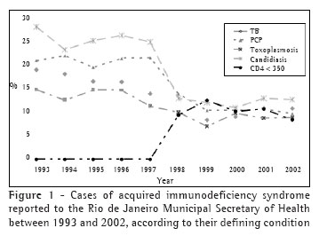 INTRODUCTIONThe use of highly active antiretroviral therapy (HAART) is related to a decrease in the incidence of most opportunistic infections (OIs).(1-2) In Brazil, antiretroviral medication is available for free to patients infected with the human immunodeficiency virus (HIV) or to those with acquired immunodeficiency syndrome (AIDS), according to the treatment criteria established by the Ministry of Health and adopted nationwide.(3) Since 1982, more than 28,000 AIDS cases have been reported to the Rio de Janeiro Municipal Epidemiological Surveillance System.(4) Since 1992, zidovudine has been available to the public health network and, since 1994, other nucleoside analog reverse transcriptase inhibitors have also been available. At the end of 1996, protease inhibitors were added to the antiretroviral therapy arsenal, which had a significant impact on the life expectancy of patients with HIV/AIDS.(5-6) At the beginning of 2004, approximately 22,000 individuals were receiving antiretroviral therapy at the 54 public health facilities in the city of Rio de Janeiro.