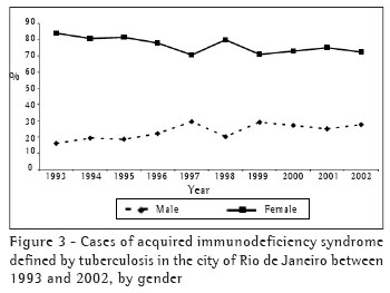 Of the total number of AIDS cases reported in the period studied, 2842 (12.4%) presented TB as an accompanying disease at the time they were reported. Of those 2842 cases, 77% were in males, and 23% were in females. This is similar to the 65% male/35% female profile found among the TB cases reported to the Rio de Janeiro Municipal Program for the Surveillance of Tuberculosis (Figure 3).