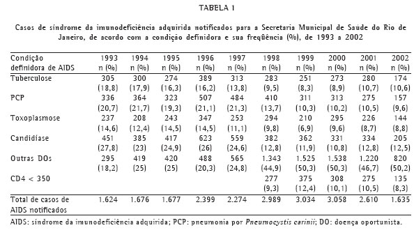 De janeiro de 1993 a dezembro de 2002, 22.976 casos de AIDS foram notificados à Vigilância Epidemiológica do Programa de Doenças Sexualmente Transmissíveis e Síndrome da Imunodeficiência Adquirida do Município do Rio de Janeiro. Desse total, as cinco condições mais freqüentes que definiram os casos como AIDS, no momento em que estes foram notificados ao Sistema de Informação de Agravos de
