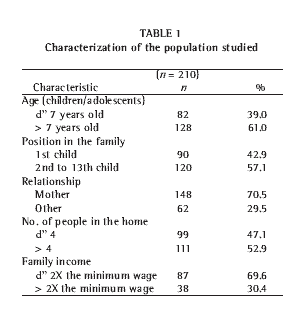 Table 1 shows the characteristics of the population studied. Of the 210 children evaluated, 128 (61%) were over the age of 7, and 90 (42.9%) were the first-born child. Among the interviewees, 148 (70.5%) were the mothers. We observed that 111 (52.9%) of the homes studied housed more than 4 people, and that, in 87 (69.6%) of these homes, the family income was lower than 2 times the official minimum wage.