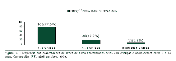 Conforme o esperado em estudo de asma em comunidade, verifica-se na Figura 1 que, em 11/210 crianças entrevistadas (5,2%), havia relato de seis ou mais crises no último ano (2001). Ressalta-se que, na comunidade, os casos de asma episódica freqüente correspondem a uma pequena parcela do total e poderiam ser perfeitamente absorvidos e adequadamente tratados em ambulatório específico para esse fim. Com relação à gravidade das crises, a maioria das crianças e adolescentes apresentou crises leves. Houve, pois, uma redução significativa do número e gravidade de crises. Isso se deve provavelmente, como foi dito anteriormente, à eficiente atuação do programa de saúde da família de Camaragibe, primeiro município a receber reconhecimento internacional do UNICEF.