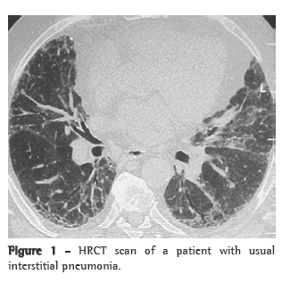 The clinical diagnosis of idiopathic pulmonary fibrosis (IPF) is associated with the histopathological pattern known as usual interstitial pneumonia (UIP).(1) The mean survival, after IPF has become established, ranges from two to six years.(2) More than 50% of patients with IPF die within two to three years after diagnosis,(3) as a consequence of complications resulting from the severe restrictive ventilatory defect, for which there is currently no satisfactory treatment.(4) In Brazil, data on the incidence and prevalence of the disease are scarce.(5) However, based on a Latin-American study, it is estimated that there are 2,225 new cases in men and 1,416 in women per year in the state of São Paulo alone. The mortality rate in the south of Brazil was reported to be 0.48/100,000 population in the 1990s.(5)