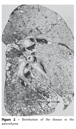 Since UIP has a heterogenous aspect, from a histological and tomographic standpoint, it cannot be adequately represented even in surgical biopsy specimens. This suggests that the site to be biopsied should be selected with caution, since the quality of the biopsy influences the diagnostic yield and the accuracy of disease staging. However, in the current literature, there is no consensus regarding the biopsy site, the ideal size of the lung parenchyma samples to be obtained or the number of such samples needed.(8-13) Nor is it known what influence these factors have on diagnosis or disease staging. Existing studies using semiquantitative techniques for histopathological analysis to evaluate biopsy samples obtained from distinct lung lobes present conflicting results.(8-13) As was observed, patients with IPF make ideal subjects in which to study the disparate histopathological alterations in a given patient, lung or lobe, as well as in contiguous areas.