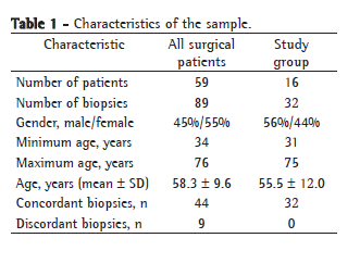 Of the 59 patients selected, 28 were excluded for having had only one site biopsied. Another 9 patients had discordance between the lobes: 3 due to nonspecific interstitial pneumonia; 3 due to an unclassifiable pattern; and 3 due to the fact that they had only emphysema in one of the lobes. Of the remaining 22 patients, 4 had had two specimens collected from the same lobe and 2 were excluded for having been submitted to biopsies that were performed on the same side (the right) but did not include the middle lobe.