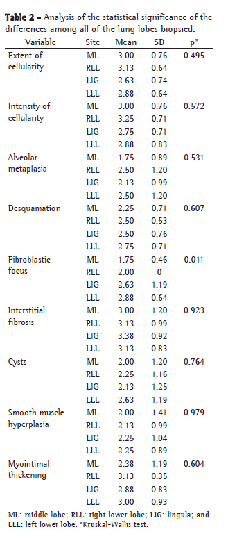 Objective: To evaluate the differences between surgical biopsies of distinct lung lobes in terms of the histopathological features of usual interstitial pneumonia, using a semiquantitative score. Methods: We selected all of the patients diagnosed with idiopathic pulmonary fibrosis and submitted to surgical biopsy in two distinct lobes between 1995 and 2005 at the Hospital São Paulo and other hospitals operated by the Federal University of São Paulo. In the histological evaluation of the specimens, we used a semiquantitative method based on previous studies, assigning a score to each of the biopsied sites. Results: In this sample of patients, we found no statistically significant differences that would alter the stage of the disease, based on the score used. This finding was independent of the biopsy site (middle lobe or lingular segment). Conclusions: No significant histological differences were found between the lung lobes studied. The definitive histological diagnosis of usual interstitial pneumonia did not alter the stage of the disease.