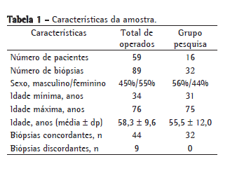 Deste grupo inicial, 16 pacientes (32 biópsias) preencheram plenamente os critérios de inclusão estabelecidos. Nessa seleção de pacientes, foi realizada a análise estatística, sendo separados, pelo local de biópsia, em quatro grupos.
