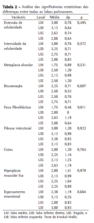 Quanto às outras variáveis, apenas a presença de focos fibroblásticos mostrou-se diferente entre os lobos estudados (p = 0,011, Tabela 2).