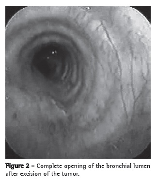 In recent years, endoscopic treatment has been increasingly used to treat benign endobronchial lesions. In selected cases, therapeutic bronchoscopy is effective, safe, and minimally invasive, offering the possibility of same-day discharge after the procedure.(4) Resection by electrocautery and argon plasma coagulation has been described, as has the use of laser and cryotherapy. In the present study, we present the clinical features and results of the bronchoscopic treatment of four cases of benign tumors of the bronchial tree.