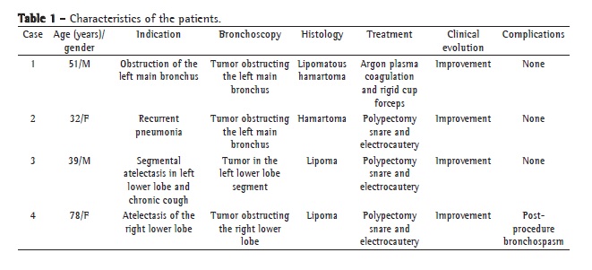 We reviewed the cases of four patients with benign tumors of the bronchial tree that were treated endoscopically. A summary of the characteristics of the patients is shown in Table 1. The Research Ethics Committee of the University of São Paulo School of Medicine Hospital das Clínicas approved the study.
