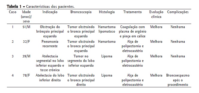 Nos últimos anos, o tratamento endoscópico tem sido cada vez mais utilizado no tratamento de lesões endobrônquicas benignas. Em casos selecionados, a broncoscopia terapêutica é efetiva, segura e minimamente invasiva, oferecendo a possibilidade de alta no mesmo dia após o procedimento.(4) A ressecção por eletrocautério e a coagulação com plasma de argônio foi descrita, assim como o uso de laser e crioterapia. No presente estudo, apresentamos os aspectos clínicos e os resultados do tratamento broncoscópico de quatro casos de tumores benignos da árvore brônquica.