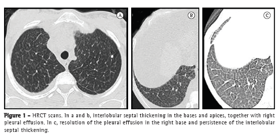 The patient developed chronic liver failure, having undergone orthotopic liver transplantation with splenectomy in September 2010. Four months later, there was complete resolution of the respiratory symptoms. At the time, a second pulmonary function test revealed improvement in the spirometric parameters (FEV1 = 2.53 L [80.7% of predicted]; FVC = 2.79 L [77.8% of predicted]; and FEV1/FVC ratio = 90.8%), and there was improvement in the 6MWD, which increased to 426 m, without desaturation (SpO2 = 98%). A second HRCT scan revealed resolution of the pleural effusion (Figure 1c) and persistence of the interlobular septal thickening.