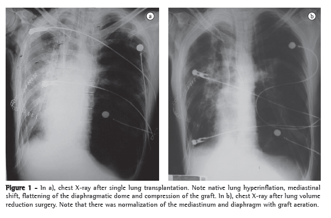 Single lung transplantation is a well-established therapeutic option for the treatment of respiratory failure resulting from emphysema.(9) This procedure makes it possible to ­maximize the use of organs (a single donor for two recipients), as well as allowing relatively minor surgical trauma and satisfactory postoperative pulmonary function. However, maintaining the native lung can cause hyperinflation, with consequent mediastinal shift and compression of the graft.