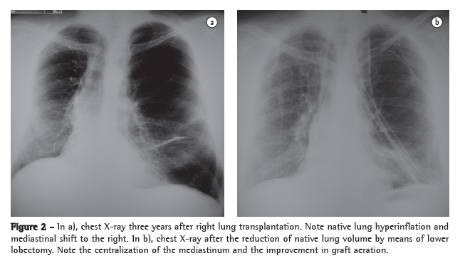 After hyperinflation has become established, reduction of native lung volume, by means of lobectomy or lung volume reduction surgery, becomes the treatment of choice. A number of studies have reported functional improvement in patients after surgical treatment.(11) Although this procedure can be performed simultaneously with transplantation, it can also be performed later, when hyperinflation is identified. This functional improvement is evidenced by improved exercise capacity, better pulmonary function test results and decreased dyspnea.(12)