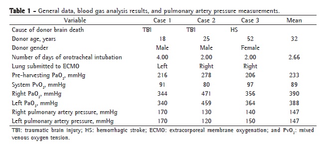 Three donor lungs were used in order to ensure the viability of the technique, and the data regarding those donors and their lungs are presented in Table 1. The cause of brain death was traumatic brain injury in two cases and hemorrhagic stroke in one case. A low PaO2/FiO2 ratio (lower than 300), as assessed by arterial blood gas analysis, was the reason why all of the lungs were considered unsuitable for transplantation, in accordance with the habitual protocol for the evaluation of donor lungs. The ages of the donors under study were 18 years, 25 years, and 52 years (mean age, 32 years). The mean time elapsed between the injection of the preservation solution and the beginning of the experiment ranged from 157 min to 201 min (mean, 184 min). The mean PaO2, as assessed by in vivo blood gas analysis, was 233.33 mmHg. The arterial blood gas analysis performed at the end of reperfusion revealed a mean PaO2 of 390.33 mmHg in the right lung and of 387.66 mmHg in the left lung. The model used in the present study allowed a stable reperfusion of the lungs and yielded reliable pulmonary artery pressure measurements throughout the reperfusion. The mean pulmonary artery pressure was 146.66 mmHg for the right and left pulmonary arteries. Mechanical ventilation was performed with a conventional anesthesia machine (Samurai Fuji Maximus SAT 500; K. Takaoka, São Paulo, Brazil). There were no mechanical ventilation-related problems, and the two lungs were uniformly ventilated when they were connected to the system.