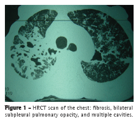 We report the case of a 56-year-old male smoker who was a rural worker and a hunter. The patient presented with a three-month history of fever, cough, expectoration, and dyspnea. He was given amoxicillin and showed partial improvement. One month later, the symptoms worsened, and this had a negative impact on his overall health status. Physical examination revealed the following: erythema multiforme on the face, trunk, and limbs; respiratory failure; and diffuse dry crackles. A chest X-ray and an HRCT scan of the chest showed extensive bilateral fibrotic lung involvement, cavities containing buds, and mediastinal adenopathy with necrosis (Figure 1). An axial CT scan of the abdomen showed enlarged adrenal glands. In view of his prolonged respiratory symptoms, fever, poor overall health status, and bilateral fibrotic lung involvement, with multiple cavities and nodules, we hypothesized the following: pulmonary tuberculosis or chronic deep fungal infection, the latter being due to extensive fibrosis and being active because of the fever, ground-glass lesions, and cavity contents. The findings of mediastinal adenopathy with necrosis and adrenal enlargement with necrosis were consistent with our hypotheses. Because of the clinical presentation, imaging test results, and patient history, we established a presumptive diagnosis of paracoccidioidomycosis or histoplasmosis, given that both deep fungal infections are endemic in Uruguay. The differential diagnosis included systemic vasculitis, Churg-Strauss syndrome (because the type of skin involvement was not typical of the deep fungal infections hypothesized), and Wegener's granulomatosis (because of the presence of cavitary lung involvement). The laboratory test results were as follows: hemoglobin, 10.2 g/dL; platelet count, 563,000/mm3; white blood cells, 9,400/mm3; eosinophils, 3%; ESR, 130 mm/h; HIV testing, negative; urea level, normal; antinuclear antibody testing, negative; rheumatoid factor testing, negative; anti-DNA antibody testing, negative; antineutrophil cytoplasmic antibody testing, negative; BAL fluid, normal; direct bacteriological examination for nonspecific pathogens, negative; culture for nonspecific pathogens, negative; testing for Mycobacterium tuberculosis, negative; mycological examination, negative; bronchial brushing, negative; serial blood cultures for bacteria, negative; PPD testing, negative; serial sputum smear microscopy, negative; direct examination, negative; and culture, negative.