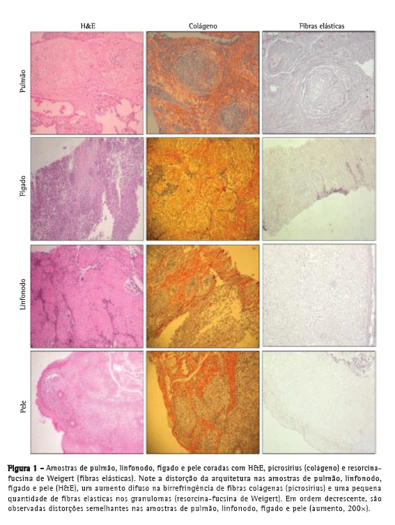 Por todos os motivos expostos, não seria surpreendente descobrir que a imunomarcação celular e a determinação da densidade de fibras colágenas/elásticas podem fornecer informações relevantes sobre a remodelação tecidual na sarcoidose. Nossos resultados confirmam as implicações patogênicas da infiltração de células imunes e o estado de remodelação de granulomas na sarcoidose pulmonar e extrapulmonar. Embora apenas alguns estudos voltados à investigação da produção de proteínas da MEC, TGF-, fibrina e metaloproteinases da MEC tenham conseguido demonstrar uma associação significativa entre remodelação tecidual e resposta imune na sarcoidose,(10,30) nossos resultados sugerem que um processo fibroelastótico e a infiltração de células imunes provavelmente contribuem para alterações teciduais na sarcoidose. O mais interessante é que nossos resultados sugerem que a depuração de antígenos é menos eficiente na sarcoidose pulmonar que na extrapulmonar. Mais especificamente, descobrimos que diferentes testes funcionais corroboraram a regulação das células imunes e a remodelação na sarcoidose pulmonar, o que sugere a presença de um efeito reparador sobre o desarranjo funcional e estrutural encontrado no parênquima pulmonar.