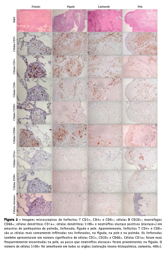 A Tabela 2 mostra a quantificação de células imunes nos granulomas pulmonares e extrapulmonares. A distribuição morfológica das células imunes nos granulomas coincidiu com as diferenças em quantificação entre as duas formas de sarcoidose. No geral, as amostras de sarcoidose extrapulmonar apresentaram densidade significativamente maior de linfócitos CD4+ (p = 0,001), linfócitos CD8+ (p = 0,001), linfócitos CD3+ (p = 0,001), linfócitos CD68+ (p = 0,03) e neutrófilos elastase positivos (p = 0,001) circundando ou permeando estruturas granulomatosas do que as amostras de sarcoidose pulmonar. O número de linfócitos CD4+ foi significativamente maior nos granulomas encontrados nas amostras de linfonodos do que naqueles encontrados nas amostras de fígado (p = 0,05), pele (p = 0,03) e pulmão (p = 0,001). Além disso, o número de linfócitos CD8+ ao redor de granulomas foi significativamente maior nas amostras de linfonodos do que nas de pulmão e pele (p = 0,001 e p = 0,003, respectivamente). Ademais, o número de linfócitos CD8+ foi significativamente maior nas amostras de fígado do que nas de pulmão (p = 0,01). Os granulomas encontrados nos linfonodos também apresentaram maior número de linfócitos CD3+, CD20+ e CD68+ do que os encontrados nos pulmões (p = 0,001, p = 0,01 e p = 0,004, respectivamente). O número de células CD1a+ foi maior nos granulomas encontrados na pele que naqueles encontrados nos pulmões, linfonodos e fígado (p = 0,001 para todos). O número de neutrófilos elastase positivos permeando granulomas foi maior no fígado que nos pulmões (p = 0,02). A quantidade de células S100+ foi muito semelhante nos granulomas encontrados nos diversos órgãos estudados.