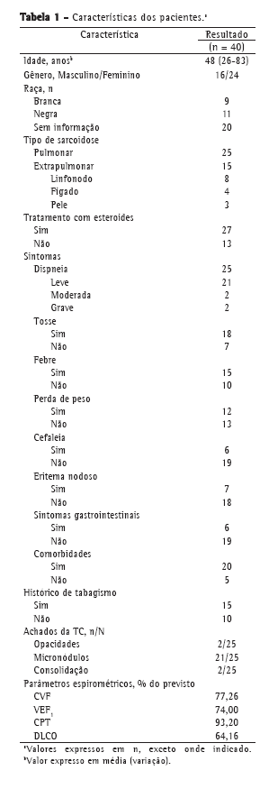 A Tabela 1 lista as características dos 40 pacientes incluídos no estudo, isto é, 16 homens e 24 mulheres, com média de idade de 48 anos (variação: 26-83 anos). Dos 40 pacientes, 11 eram negros. A maioria dos 25 pacientes com sarcoidose pulmonar apresentou padrão restritivo ou obstrutivo, e 15 eram fumantes ou ex-fumantes. Vinte e sete pacientes receberam corticoterapia.