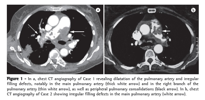 A 61-year-old female patient was referred to our facility because of a ten-month history of dry cough and progressive dyspnea prior to admission. In the last six months, there had been worsening of symptoms, with the onset of symmetric edema in the lower limbs, weight loss (10 kg in the last eight months), and sporadic evening fever (which was not measured). The patient had a personal history of arterial hypertension, controlled with diltiazem, amlodipine, and atenolol, and was a smoker (smoking history, 10 pack-years). She reported no history of venous thromboembolism. The patient had sought emergency care in her hometown, being submitted to chest CT angiography, the findings of which were interpreted as pulmonary thromboembolism. At that point, the patient was started on anticoagulation with warfarin, which was discontinued one month after an episode of hemoptysis with no hemodynamic repercussions.