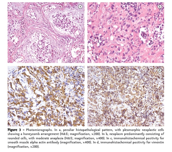 A biopsy of the right anterior descending branch revealed a malignant neoplasm with a solid pattern and consisting of atypical, pleomorphic cells with intense mitotic activity and nuclear anaplasia, mostly spherical, tending to be aggregated in a peculiarly "honeycomb" pattern. The immunohistochemical profile consisted of vimentin and smooth muscle alpha actin positivity, whereas antibodies to CD31, CD34, CD45, cytokeratin AE1/AE3, desmin, S-100 protein, and thyroid transcription factor-1 were negative, confirming the diagnosis of pleomorphic leiomyosarcoma of the pulmonary artery (Figure 3).