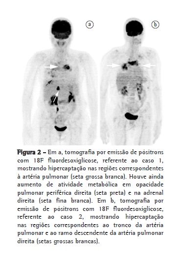 Diante dos achados clínicos e radiológicos associados à presença de hipertensão pulmonar, cogitou-se a hipótese de neoplasia de artéria pulmonar. Solicitou-se a FDG-PET, o qual demonstrou hipercaptação do FDG - standardized uptake value (SUV, valor padronizado de captação) de 14,8 - nas áreas com falha de enchimento na artéria pulmonar, além do aumento de atividade metabólica em opacidade pulmonar periférica direita (SUV = 6,5) e na adrenal direita (SUV = 14,3; Figura 2a).