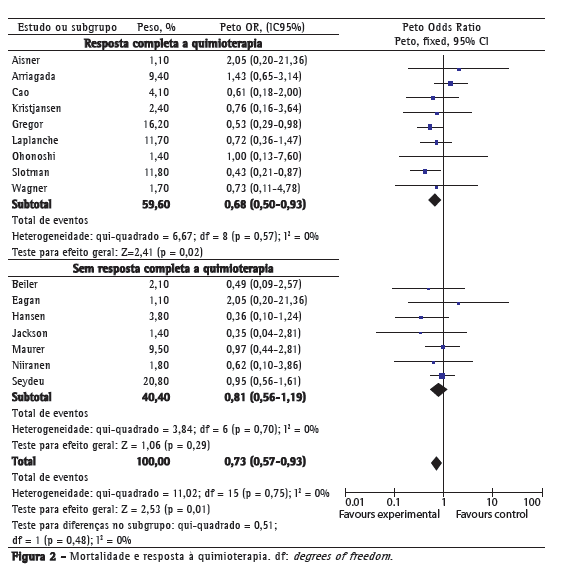 In the late 1970s, RCTs comparing patients with SCLC in complete remission treated with PCI and those treated without PCI consistently showed a significant reduction in the incidence of brain metastases and no increase in evident neurological complications in the patients treated with PCI.(6,8-10,12) However, the beneficial effects of PCI on overall survival remained unclear until 1999, when one group of authors performed a meta-analysis of 7 RCTs involving 987 patients in order to guide clinical practice recommendations.(20) The clinical trials included in that meta-analysis met strict inclusion criteria, i.e., trials involving patients who were treated with systemic chemotherapy (with or without thoracic radiation therapy), who had a complete clinical response, and who were subsequently randomized to receive or not to receive PCI. The major finding of that meta-analysis was a significant improvement in the overall survival and disease-free survival of patients submitted to PCI. However, ever since that meta-analysis was published, questions have been raised about the optimal interval between induction chemotherapy and PCI initiation; about whether patients with extensive disease really benefit from PCI; and about the most effective radiation therapy dose. Therefore, the primary objective of our meta-analysis was to determine the subgroups of patients with SCLC that most benefit from PCI. By evaluating 1,983 patients enrolled in 16 RCTs, we found that PCI reduces mortality from SCLC by approximately 4%, particularly in patients who have a complete response to chemotherapy and who undergo PCI after induction chemotherapy, regardless of the disease stage. These findings are similar to those of the meta-analysis published in 1999, in which the three-year survival rate for patients undergoing PCI was reported to have increased by 5.4%.(20) However, our meta-analysis differs from the 1999 meta-analysis in that we included RCTs involving patients with extensive disease and without response to chemotherapy.