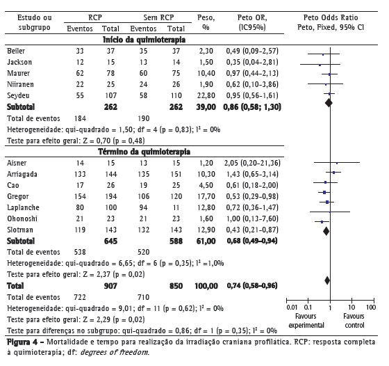 Objetivo: Determinar o papel da irradiação craniana profilática (ICP) em pacientes com câncer de pulmão de pequenas células (CPPC). Métodos: Foi realizada uma pesquisa para selecionar estudos em várias bases de dados, com os seguintes critérios de inclusão: ensaios clínicos randomizados, publicados em periódicos ou em anais de congressos nos últimos 30 anos, avaliando o papel da ICP sobre a mortalidade em pacientes com CPPC que receberam ICP ou não. Resultados: Foram considerados elegíveis 16 estudos clínicos randomizados, os quais envolveram 1.983 pacientes. Entre esses, 1.021 foram submetidos a ICP e 962 não foram submetidos a ICP. Houve uma redução absoluta na mortalidade de 4,4% nos pacientes submetidos a ICP quando comparados com o grupo controle (OR = 0,73; IC95%: 0,57-0,97; p = 0,01), principalmente naqueles com resposta completa à quimioterapia de indução (OR = 0,68; IC95%: 0,50-0,93; p = 0.02) e que foram submetidos a ICP ao término desse tratamento (OR = 0,68; IC95%: 0,49-0,94; p = 0.03). A diminuição da mortalidade não se correlacionou com o estádio da doença: doença limitada (OR = 0,73; IC95%: 0,55-0,97; p = 0,03) e doença extensa (OR = 0,48; IC95%: 0,26-0,87; p = 0,02). Conclusões: Nossos achados sugerem que a ICP reduz a mortalidade em pacientes com CPPC, principalmente naqueles com resposta a quimioterapia de indução e que sejam submetidos a ICP ao término desse tratamento, independentemente do estadiamento da doença.