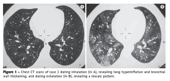 In our case series, the HRCT findings, especially air trapping (found in all of the patients) and bronchial wall thickening, formed a pattern that is characteristic of bronchiolitis.(7,9) Ground-glass opacities, observed in one of the four cases, are rarely reported in the literature.(9)