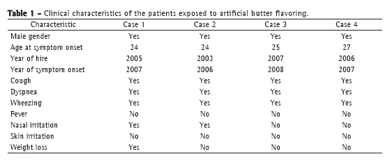 IntroductionThe etiology of bronchiolitis in adults is varied, including viral infections, smoking, inhalation of toxic substances, chronic lung and bone marrow transplant rejection, collagen diseases, and idiopathic forms.(1) In view of its clinical and spirometric characteristics, bronchiolitis is often confused with diseases that are more common, especially asthma and COPD. Although the clinical course of bronchiolitis is variable, progression to severe and incapacitating obstructive disease is common. In recent years, a severe form of bronchiolitis caused by inhalation of flavoring agents has been reported in food factory workers, especially in microwave popcorn production workers (hence the term "popcorn lung"), mainly in the USA, but also in Europe.(2-7) The objective of the present study was to report the clinical, tomographic, and spirometric findings in four young patients exposed to artificial butter flavoring at a cookie factory in Brazil, as well as the lung biopsy findings in one of the patients.