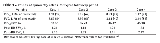 In the initial spirometry test, all of the patients showed a moderate to severe obstructive pattern, with reduced FVC (Table 2). Two cases showed significant responses to inhaled albuterol (cases 1 and 4). The spirometry tests performed 4 years later revealed persistence of the airflow obstruction pattern (Table 3). Neither TLC nor DLCO was determined, because the required equipment was unavailable in our region.
