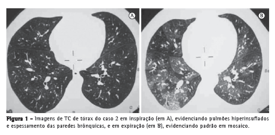 A radiografia de tórax evidenciou hiperinsuflação pulmonar em três casos e foi normal apenas no caso 1. Entre as alterações encontradas na TC de tórax, estavam presentes hiperinsuflação pulmonar, aprisionamento aéreo, espessamento brônquico e perfusão em mosaico (Figura 1). A presença de vidro fosco foi evidenciada apenas no caso 4.