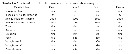 ResultadosQuatro jovens do sexo masculino, previamente hígidos, não tabagistas, com idade entre 24 e 27 anos na ocasião da primeira consulta, que trabalhavam numa fábrica de biscoitos no Recife, tiveram exposição ao aroma de manteiga - diacetil (2,3-butanodiona) - por períodos que variaram de 1-3 anos. Todos trabalhavam no preparo da massa do biscoito, que constava de uma mistura contendo o aroma artificial de manteiga, gordura vegetal, farinha de trigo, açúcar, entre outros ingredientes, sem aquecimento. Todos referiam forte cheiro ao manusear o aroma artificial de manteiga e nenhum deles usava equipamentos de proteção individual, tais como máscaras, contrariando a recomendação existente no rótulo do produto.