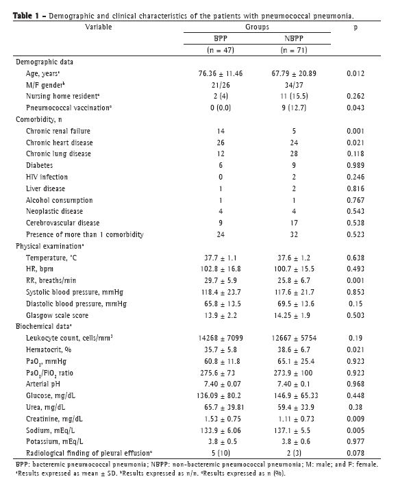 In the present study, we found certain differences between the characteristics of BPP and those of NBPP. We found that BPP was more common in older individuals than was NBPP, a finding that is in disagreement with those of previous studies.(15,16) We were unable to compare the incidence of BPP and NBPP in HIV-positive patients and intravenous drugs users with the incidence of BPP and NBPP in patients who did not have those characteristics because the incidence of HIV infection and intravenous drug use in our hospital population was zero. One third of our population had been diagnosed with COPD, a comorbidity that tended to be more common in NBPP patients (p = not significant). We found a predominance of BPP in patients with chronic heart disease or chronic renal failure, as has been reported, especially in elderly individuals who present with neutrophil dysfunction, decreased production of immunoglobulins, and malnutrition.(17)