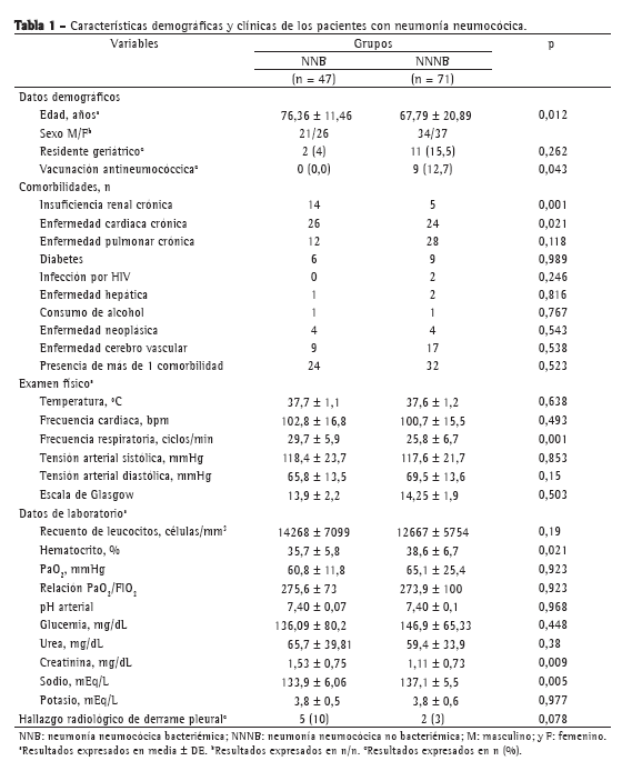 Durante 4 años fueron hospitalizados 798 pacientes con diagnóstico de NAC, se excluyeron 158 del análisis por no alcanzar todos los criterios de inclusión o tener algún criterio de exclusión. De los 640 pacientes, se seleccionaron aquellos que tenían hallazgos bacteriológicos que confirmaban la etiología por S. pneumoniae, quedando como resultante 118 pacientes. Cuarenta y siete cumplían los criterios de NNB y 71 de NNNB. Hubo 23 pacientes ambulatorios; de éstos, en 5 pacientes se documentó bacteriemia por S. pneumoniae.
