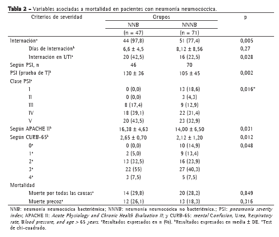 Del total de 118 casos, fallecieron 34 pacientes (28,6%) con neumonía por neumococo. En éstos pacientes, la edad mayor a 65 años, la residencia en geriátrico, la taquicardia e hipotensión al ingreso, un hematocrito menor de 30%, una PaO2/FiO2 < 250 ó saturación de oxígeno < 90%, fueron variables asociadas significativamente a mayor mortalidad. Entre las comorbilidades, la presencia de insuficiencia cardíaca ó renal crónica, o la enfermedad neurológica; así como la presencia de más de una comorbilidad se relacionaron con mayor mortalidad. La internación en la UTI, la presencia de CURB-65  2 ó PSI IV-V se asociaron también a mal pronóstico. Sin embargo, al analizar estas características de acuerdo a si tenían bacteriemia ó no, no se hallaron diferencias estadísticamente significativas entre ambos grupos (Tabla 4).