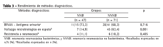 Con respecto a los métodos diagnósticos, el hallazgo bacteriológico en esputo y/o el antígeno urinario nos permitió detectar el grupo no bacteriémico, es interesante mencionar que si bien estos métodos se aplicaron tanto en el grupo NNNB como en el NNB, se obtuvieron menos rescates bacteriológicos en el esputo en NNB (Tabla 3).