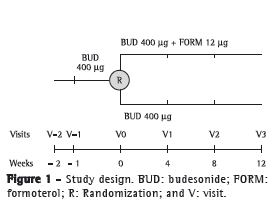 MethodsThis was a randomized, double-blind, multicenter (four centers), phase III, parallel clinical trial conducted in Brazil and comparing the efficacy and safety of a fixed-dose, single-capsule combination of budesonide 400 µg and formoterol 12 µg (Alenia®; Biosintética Farmacêutica Ltda., São Paulo, Brazil) with those of budesonide 400 µg alone (Busonid Caps®; Aché Lab Farm S.A., Guarulhos, Brazil) in adults with partially controlled asthma, as determined on the basis of the classifications proposed by the Global Strategy for Asthma Management and Prevention and the Fourth Brazilian Guidelines for Asthma Management.(1,3) After a run-in period of 4 weeks, during which all of the patients received 400 µg of inhaled budesonide twice daily, they were randomized into one of the treatment groups. The randomization scheme, i.e., permuted blocks of size 4 at a 1:1 ratio, was generated by the Statistical Analysis System, version 9.1.3 (SAS Institute, Gary, NC, USA).
