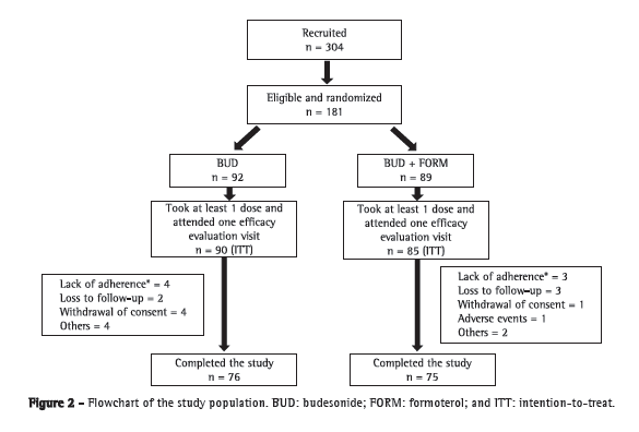 ResultsBetween April of 2009 and June of 2010, 304 adults with asthma were recruited from among those being treated at any of four research centers in Brazil. Of those 304 patients, 181 were included in the study and were randomized into one of the intervention groups; 175 participants used at least one dose of the medication (90 in the budesonide-only group and 85 in the budesonide-formoterol [BF] group), being included in the intention-to-treat analysis (Figure 2). The demographic characteristics and the baseline spirometric parameters are summarized in Table 1 and were similar between the treatment groups.