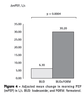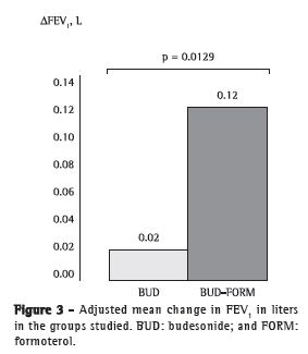 Regarding the primary outcome measures, the 12-week treatment resulted in statistically significant mean increases in FEV1 and morning PEF-of 104 mL (95% CI: 22-186 mL) and 23.93 L/min (95% CI: 10.89-36.93 L/min), respectively-in the BF group as compared with the budesonide-only group. These results represent an estimate of the difference in change (final value - baseline value) in FEV1 in the comparison of the two groups, calculated by the following formula: