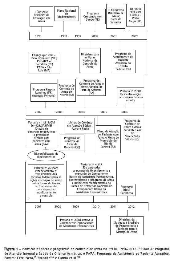 Em 23 de junho 2002, houve a assinatura da Portaria nº 1.318/GM,(10) atualizada pela Portaria nº 921/SAS/MS, de novembro de 2002,(11) que determinava que a Secretaria de Atenção à Saúde adotasse as providências necessárias para que fossem criadas diretrizes terapêuticas e protocolos clínicos para os pacientes com asma grave, disponibilizando medicamentos como beclometasona, budesonida, fenoterol, formoterol, salbutamol e salmeterol em caráter excepcional apenas aos portadores de asma grave. Também em 2002, foi implantado em Londrina (PR) um programa de controle de asma denominado Respira Londrina, com o objetivo de prevenir as crises de asma, promovendo estratégias para o atendimento dos pacientes asmáticos na atenção primária.(5)