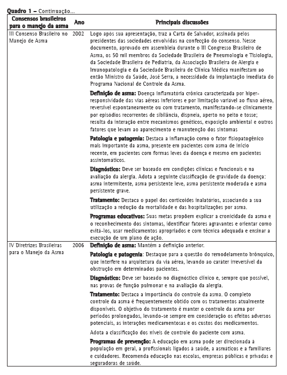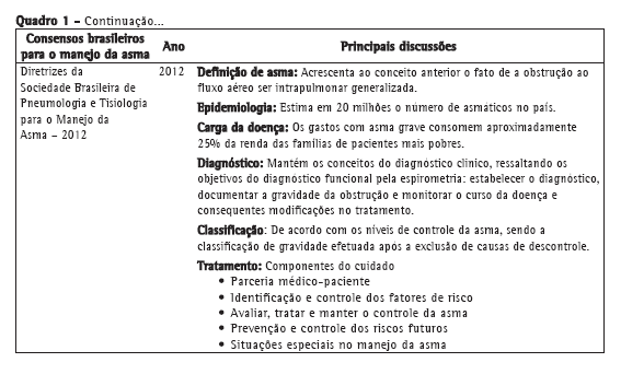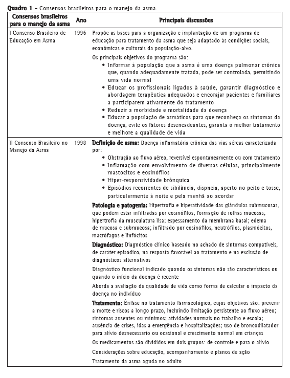 Em 1996, a Sociedade Brasileira de Pneumologia e Tisiologia, a Associação Brasileira de Alergia e Imunopatologia e a Sociedade Brasileira de Pediatria publicaram o I Consenso Brasileiro de Educação em Asma,(4) traçando um plano de educação e controle da doença. O Quadro 1 sintetiza questões abordadas nos consensos brasileiros de asma.