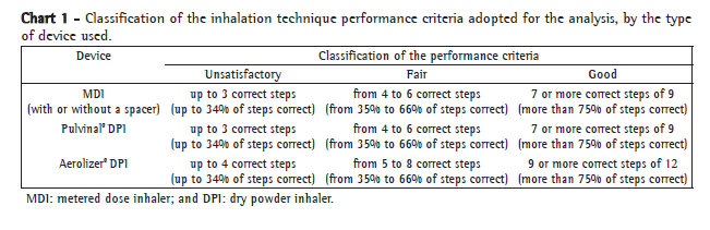 The devices evaluated in the present study were divided into two groups: metered dose inhalers (MDIs), with or without a spacer, and dry powder inhalers (DPIs). For the assessment of the ability to perform the inhalation technique correctly, the patients were asked to simulate the maneuvers involved in using the inhaler device, saying out loud which step they were performing, so that all of the steps could be observed. To that end, we adopted a score based on the number of steps correctly performed, using a maneuver checklist, adapted from the one developed by Muniz et al.,(11) in accordance with clinical practice and the directions for use supplied by the manufacturer (Chart 1).