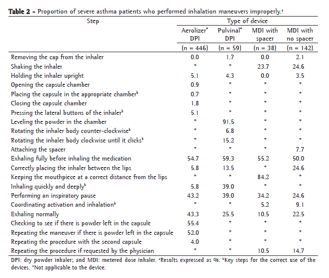 DiscussionIn the present study, we evaluated the inhaler maneuvers performed by patients with severe asthma enrolled in an asthma control program. In general, the patients performed well when using MDIs and DPIs, suggesting that they had learned how to use them. This learning might be related to the high rate of treatment compliance (> 80%), which has been reported in another study involving ProAR patients.(15)