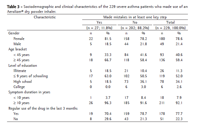Correct performance of the key steps involved in using the devices was one of the factors affecting asthma symptom control. These steps are related to placing the capsule in the correct position, piercing it for the subsequent drug release, and inhaling quickly and deeply. Inhaling quickly and deeply is crucial for fully delivering the drug to the lung, and, in the present study, this key step was the one with the highest proportion of errors. This might have contributed to the lack of asthma control among those who did not take a quick and deep inhalation correctly, which corroborates the findings of another group of authors,(18) who reported that slow inhalation is one of the reasons for partial distribution of the drug in the lung. There were no significant differences regarding clinical or sociodemographic characteristics between the subgroups of patients who made use of an Aerolizer® DPI alone. However, we observed that the patients with severe asthma who made mistakes in key steps had a lower level of education and were over 45 years of age. Similar results were reported in another study, in which the error rate in using DPIs was found to be higher among patients who were older and had a low level of education.(17)