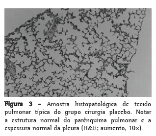 No 30º dia de pós-operatório, os ratos foram sacrificados, e a parede torácica e o parênquima pulmonar foram inspecionados em relação a aderências. As aderências foram classificadas de 1 a 4, utilizando-se os critérios de Knightly et al.(12) Para a análise histopatológica, pequenos pedaços das áreas cirúrgicas do tórax e do parênquima pulmonar, perpendiculares à superfície da ferida e incluindo tecido pulmonar normal, foram removidas e fixadas em solução de formaldeído tamponado a 10% e ágar a 1% a 42°C por 2 h. Após desidratação em soluções graduadas de etanol, as amostras foram incluídas em parafina, cortadas em seções de 4 µm, montadas em lâminas de vidro, desparafinizadas em xileno e contracoradas com HE.(13) A complacência pulmonar específica foi medida sob condições estáticas, e calculou-se a inclinação da curva pressão-volume para cada animal. As curvas foram obtidas a partir da capacidade residual funcional até a CPT.